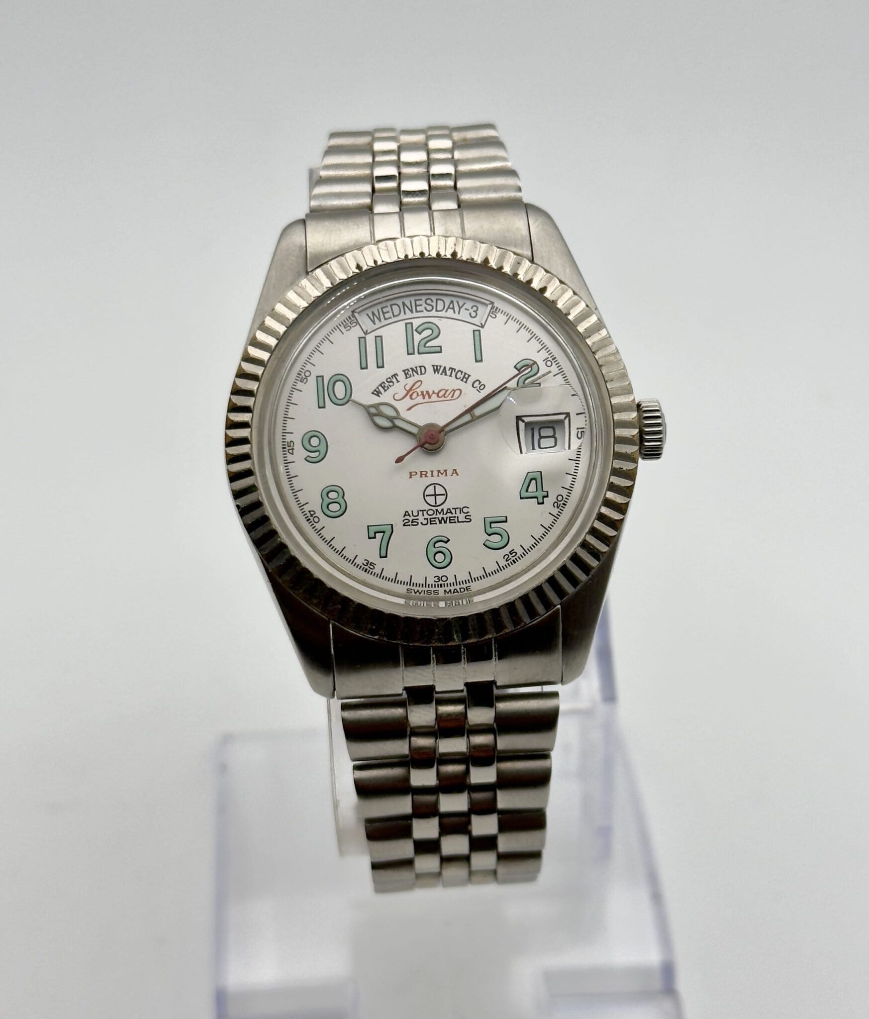 Reloj WEST END Watch Co, THE CLASSICS, Sowar, Prima Calibre ETA 2834-2, 25 rubíes, Reloj automático de caballero, Esfera limpia, Reloj vintage, Fabricado en Suiza, Día y fecha.